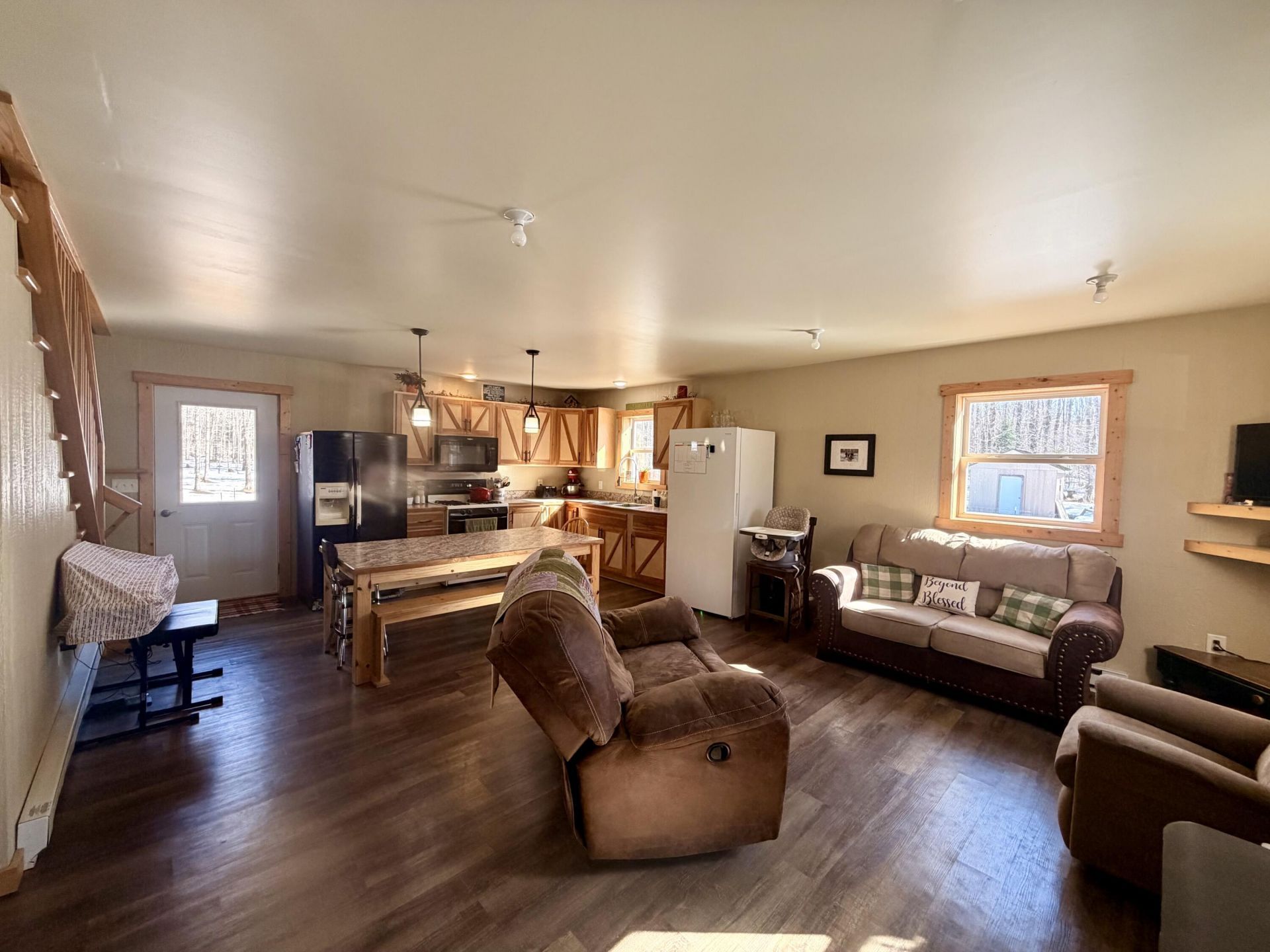 Welcome to this beautifully crafted 3 bedroom, 1 bathroom gambrel-style home, built in 2020 and quietly nestled on 9.5 acres in McMillan. This property offers the perfect blend of modern construction and homestead living, with space, functionality, and charm throughout.The home features a thoughtfully designed layout with a spacious main floor including a large entryway closet (currently used as a pantry), open living room, kitchen, laundry area, full bathroom, and primary bedroom. Upstairs, you'll find two additional bedrooms, a dedicated office/quilting room, and a large closet for added storage.Built with quality in mind, the home includes a clean, dry 6-block crawl space, an efficient wood-burning stove, and custom cabinetry and shelving throughout.