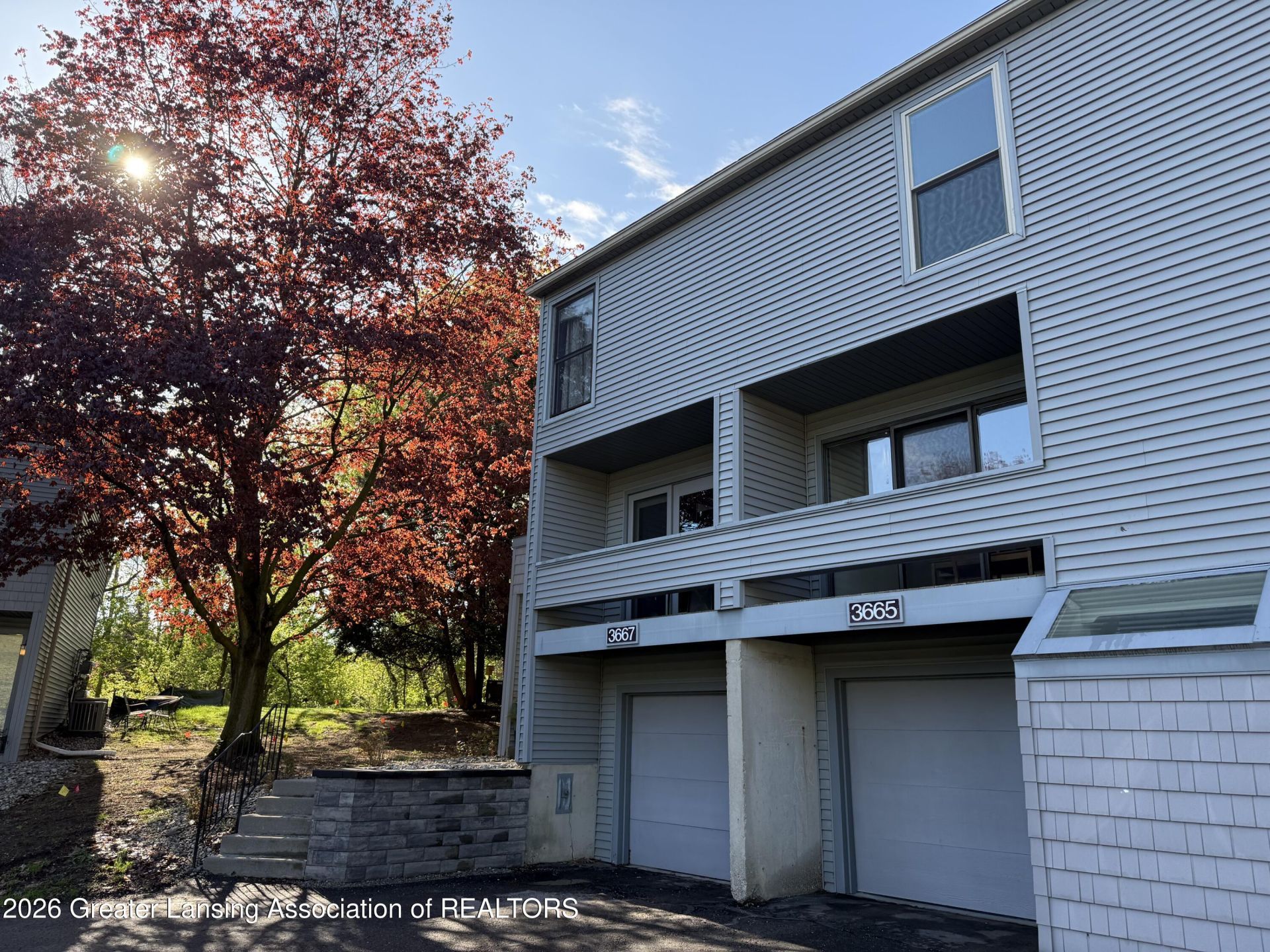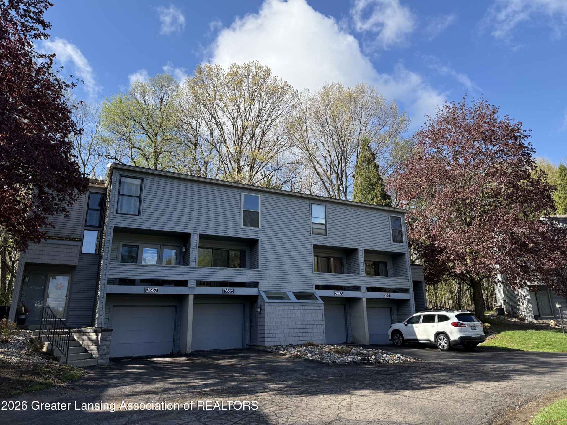 Welcome to 3665 East Meadows Living! This unique 3-story condo is located in a highly desirable area and offers a perfect blend of comfort and convenience. Step inside to find a spacious living area with a vaulted ceiling and beautiful hardwood flooring throughout the main level. A sliding glass door provides access to the back patio, where you can enjoy serene views of the natural surroundings. The kitchen is generously sized, and all appliances are included. The dining area features a sliding door that opens to the deck. The second floor offers a spacious loft area overlooking the beamed living room ceiling?ideal for a home office or relaxation space. The large primary suite includes a full bathroom with tile finishes and a skylight over the tub, bringing in plenty of natural light. The finished lower level can serve as a second bedroom or office. The laundry room is conveniently located in the basement, along with access to the attached garage. The home also features new carpet and freshly painted kitchen cabinets. Conveniently located near Okemos Public Schools, Michigan State University, shopping, dining, and major highways. The property has a rental permit and can be used as either a primary residence or a rental property. Move-in ready!