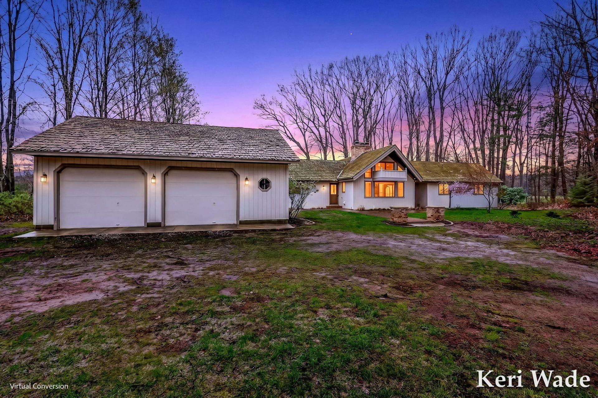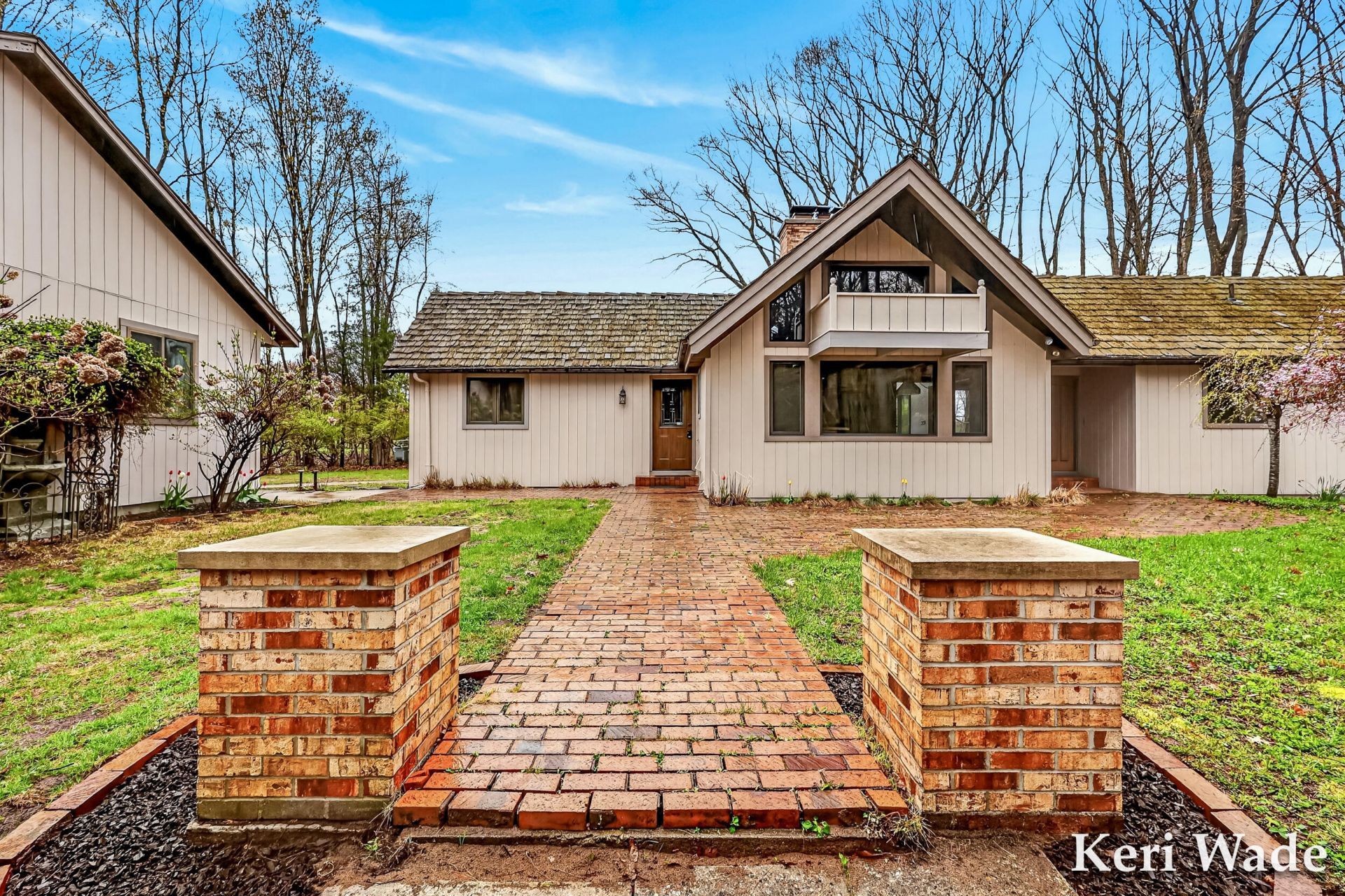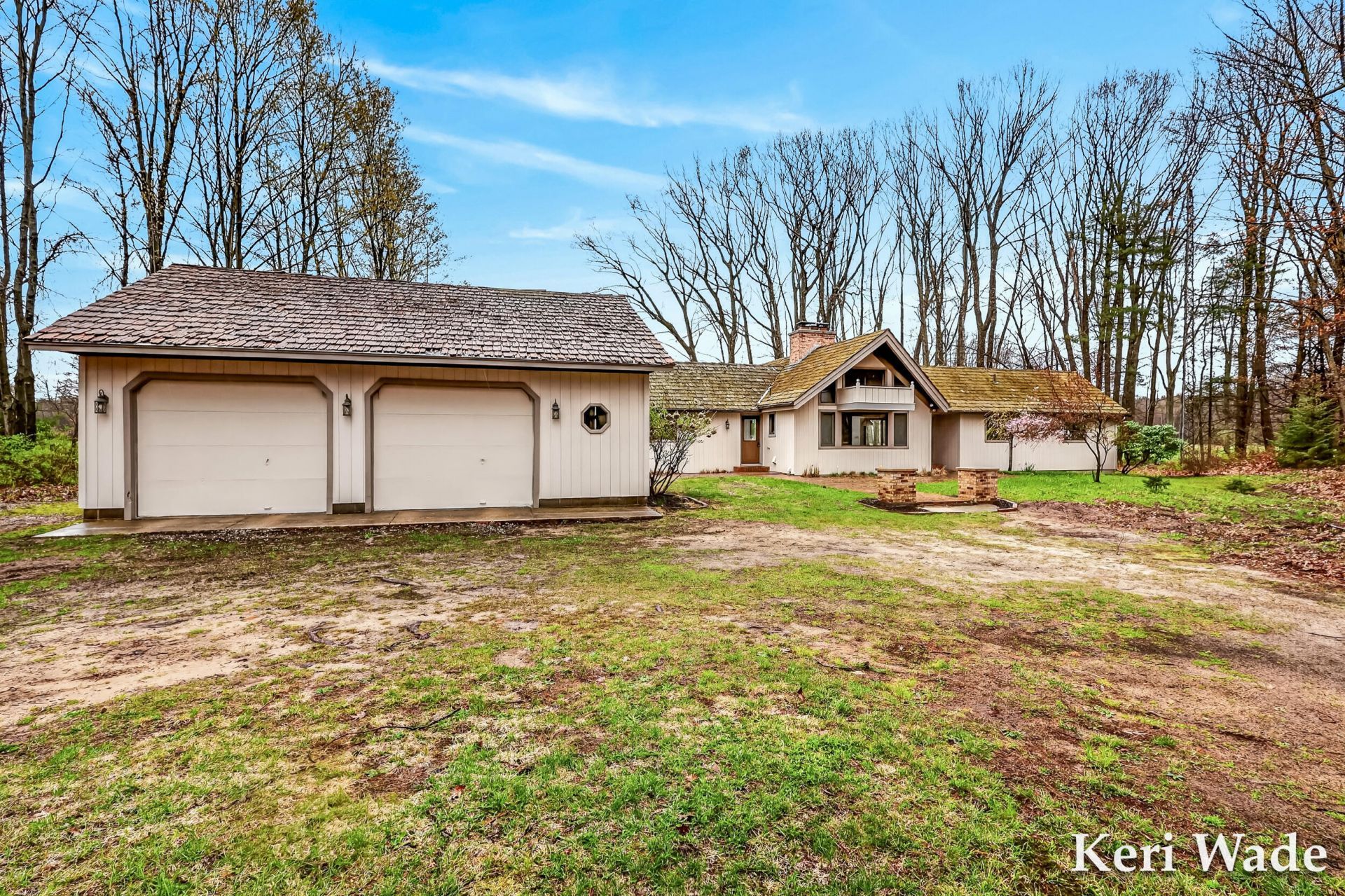 Tucked away on Scenic Dr in Whitehall, just minutes from Lake Michigan and directly across from Michillinda Lodge, this one-of-a-kind Better Homes & Gardens design (1979) offers a rare blend of architectural charm, privacy, and location. Backing up to the front nine of White Lake Golf Club, the setting is as peaceful as it is picturesque. Step inside to a stunning A-frame living room featuring soaring ceilings, a dramatic floor-to-ceiling brick fireplace, and expansive windows that flood the space with natural light. Warm wood tones carry throughout the home--from the walls and ceilings to the beautiful hardwood floors--creating a cozy, lodge-like feel. The upper-level balcony overlooks the main living space and includes a charming built-in wet bar, complete with its original retro flair. Thoughtful built-ins and clever storage solutions can be found throughout, maximizing every inch of the home, with closets galore--each equipped with its own lighting. The kitchen maint ains its vintage character while offering functional workspace, and the bright tiled entryway welcomes you in with views of the backyard and patio. The full walkout basement is unfinished, providing an excellent opportunity to add additional living space, including the potential for bedrooms and a family room. Outside, enjoy a long private drive surrounded by wooded scenery, a spacious detached 2+ stall garage with high ceilings and abundant storage, plus an attached lean-to on foundation--perfect for tools, toys, or hobby space. This home has been lovingly maintained in its original condition and offers a fantastic opportunity for those who appreciate its timeless design or want to thoughtfully update while preserving its character. Seller is installing a new range and has a new roof scheduled for installation. A boundary adjustment is currently in process; survey stakes are visible to indicate the portion being conveyed to the neighboring property. A truly special property in a sought-after location--homes like this dont come along often.