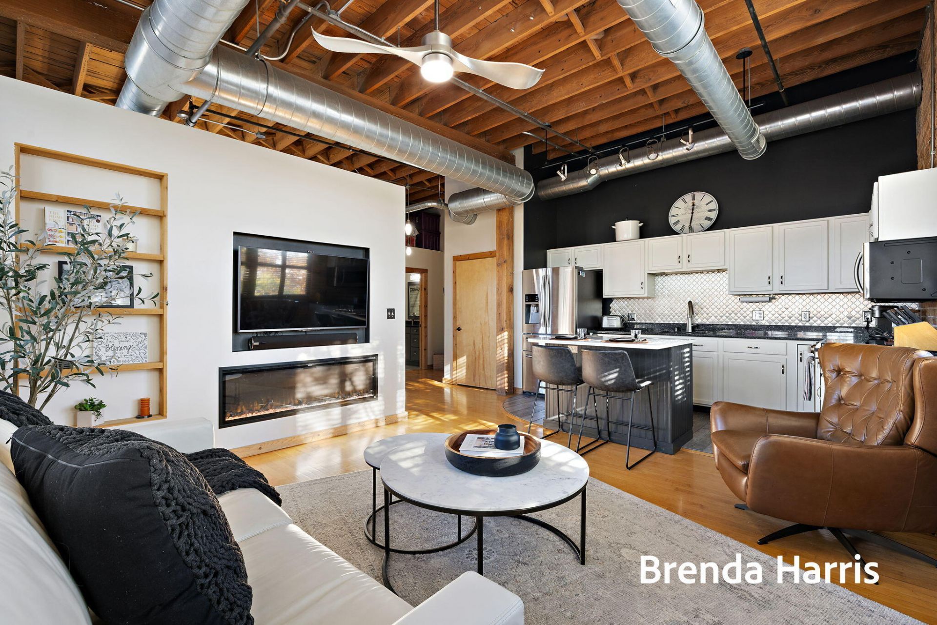 Welcome to this stunning top-floor southwest corner loft--one of the best locations in the building! This sun-filled condo features an open floor plan with rich wood floors, exposed brick walls, and soaring ceilings that bring warmth and character. The spacious kitchen offers ample cabinetry, solid-surface countertops, and a large island with seating--perfect for entertaining. The primary bedroom provides generous space and storage, while the flexible second bedroom with a Murphy bed easily transforms into a guest room, home office, or creative studio. The updated bath features a walk-in tiled shower. Two deeded prime parking spaces right next to the walking ramp add convenience and value. Dont miss your chance to experience this exceptional home on Grand Havens desirable west side--schedule your private showing today! AND as an FYI you may see the fireworks from the living room during Coast Guard week if want to stay home