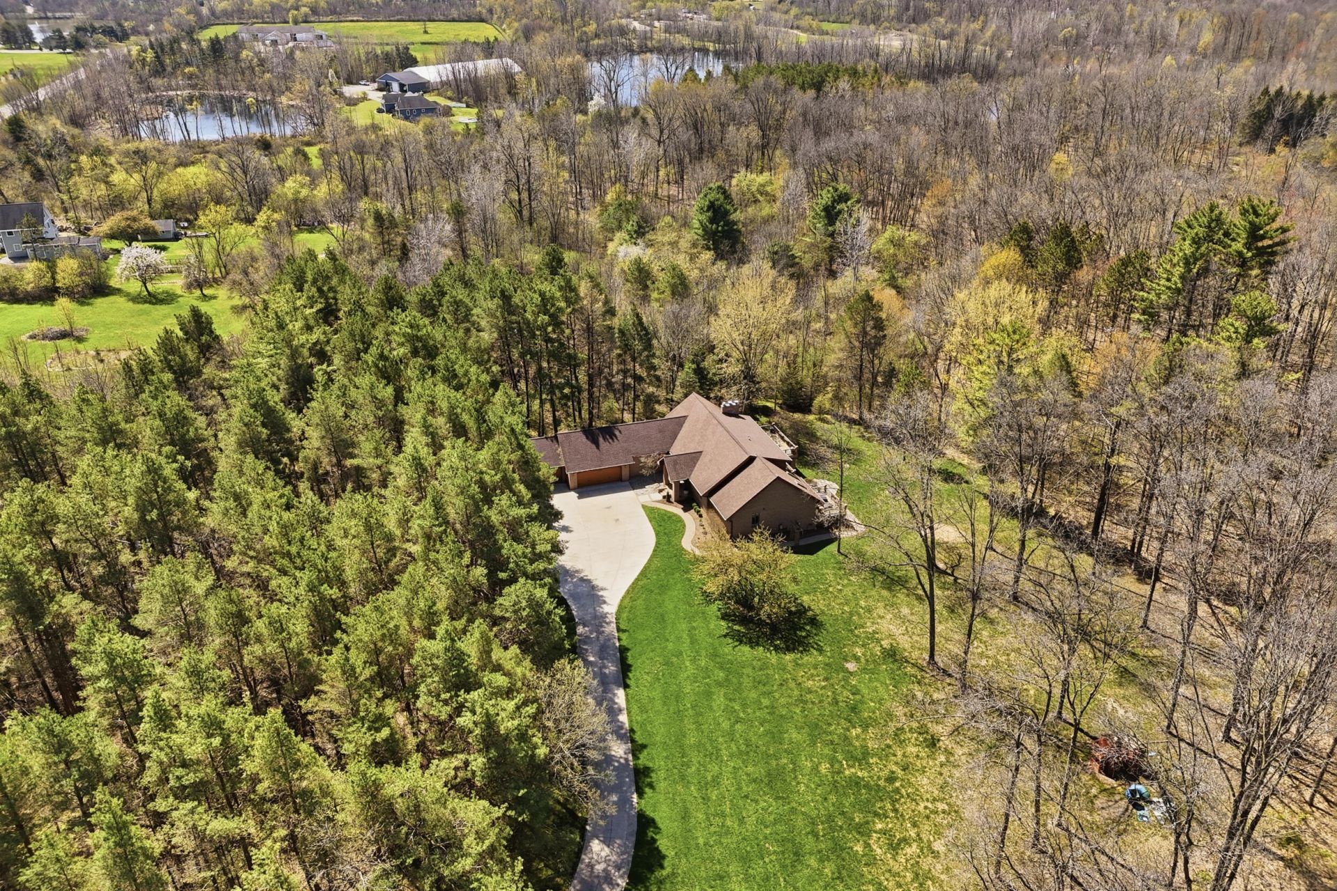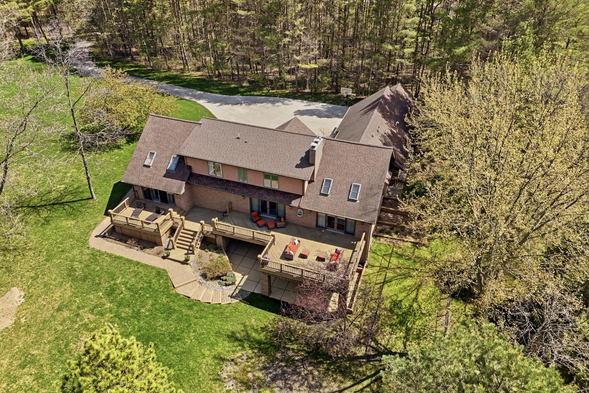 Escape through a private Tunnel of Trees to discover a magnificent 5,800+ square-foot custom retreat hidden among 60-foot towering pines. This rare 15-acre wooded sanctuary offers the perfect blend of seclusion and everyday convenience, located just minutes from the airport and major commercial centers. Designed for comfort and luxury, the home features four bedrooms, three full baths, and three half baths. Modern amenities include a heated three-car garage, custom plantation shutters, and three distinct fireplaces. Recent upgrades such as brand-new gutters installed across the entire house in 2025, a French drain system added to the front of the home in 2023, and a new water heater in 2022 add value and peace of mind.Step inside to find an exceptional interior defined by 14-foot cathedral ceilings and 60 feet of west-facing Anderson window walls that frame brilliant natural views. The breathtaking entertainers kitchen features cherry wood floors, Grabil hickory cabinets, an oversized granite island, and premium Subzero, Wolf, Viking, and Bosch appliances. A walk-in butlers pantry and dedicated coffee/wine bar make hosting simple. The kitchen flows into the spacious family room features soaring cathedral ceilings, skylights, and its own floor-to-ceiling brick fireplace, along with French doors that open directly to the massive back deck overlooking the serene woods. Adjacent, an expansive living room welcomes you with a wall of windows and another set of French doors leading out to the deck, plus a stunning floor-to-ceiling brick fireplace to complete the inviting space. The first-floor primary suite serves as your personal oasis, complete with a private deck and a luxurious 200-square-foot spa bathroom featuring a soaking tub, tiled shower, and dual vanities. The main floor also includes a massive 250-square-foot laundry and storage room designed for ultimate convenience and flexibility. Upstairs, you will find two spacious bedrooms and a full bath, alongside a cozy sitting room with a fireplace and built-in bookcases, providing a quiet retreat for relaxation or study.Head down to the finished walk-out lower level to experience an entertainers dream--this exceptional space boasts a stunning fieldstone fireplace, a sprawling built-in bar, a 1,000-bottle cedar wine cellar, a private home gym with mirrored walls, and an incredible built-in sound system. Guests will feel right at home in the large guest room with an attached ensuite bath.Outside, explore a 3/4-mile groomed walking and biking trail carved directly through your private estate, offering daily sightings of deer, hawks, and owls in their natural habitat. Schedule your private tour today to experience this unparalleled woodland estate for yourself.